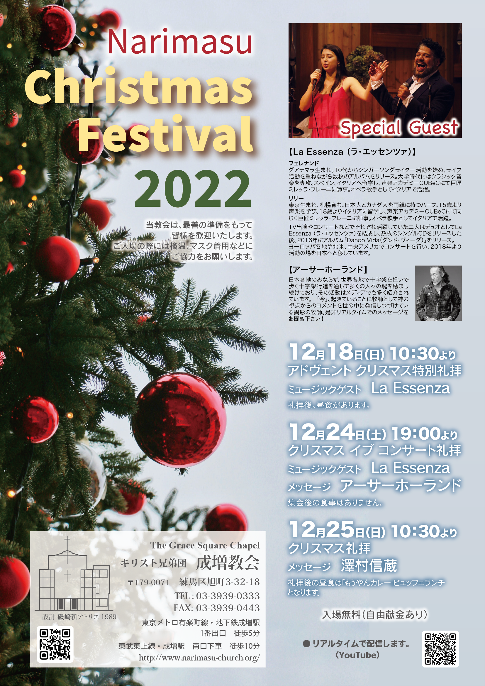 2022年のクリスマス、成増教会では下記のイベントを開催します。お誘い合わせの上、ぜひお越しください。皆様のお越しをお待ちしています。